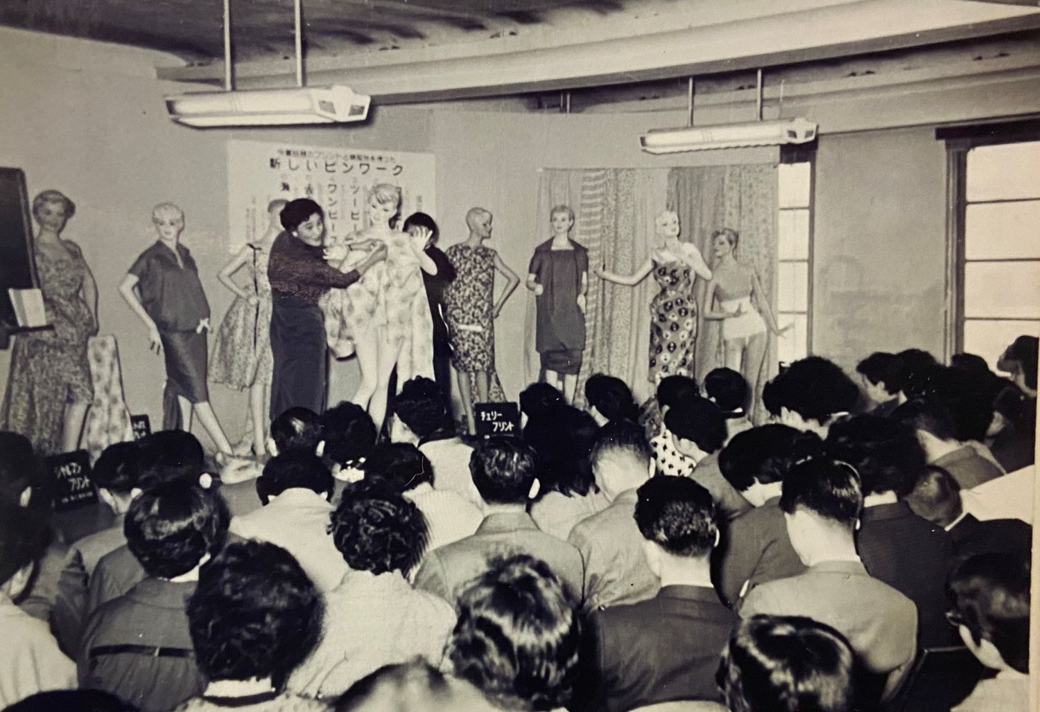 その意匠企画部主催の「大和紡プリントと先染服地を使ったセールスピンワーク講習会」は1961(昭和36)年頃から開催され、毎回多くの来場者が訪れました。