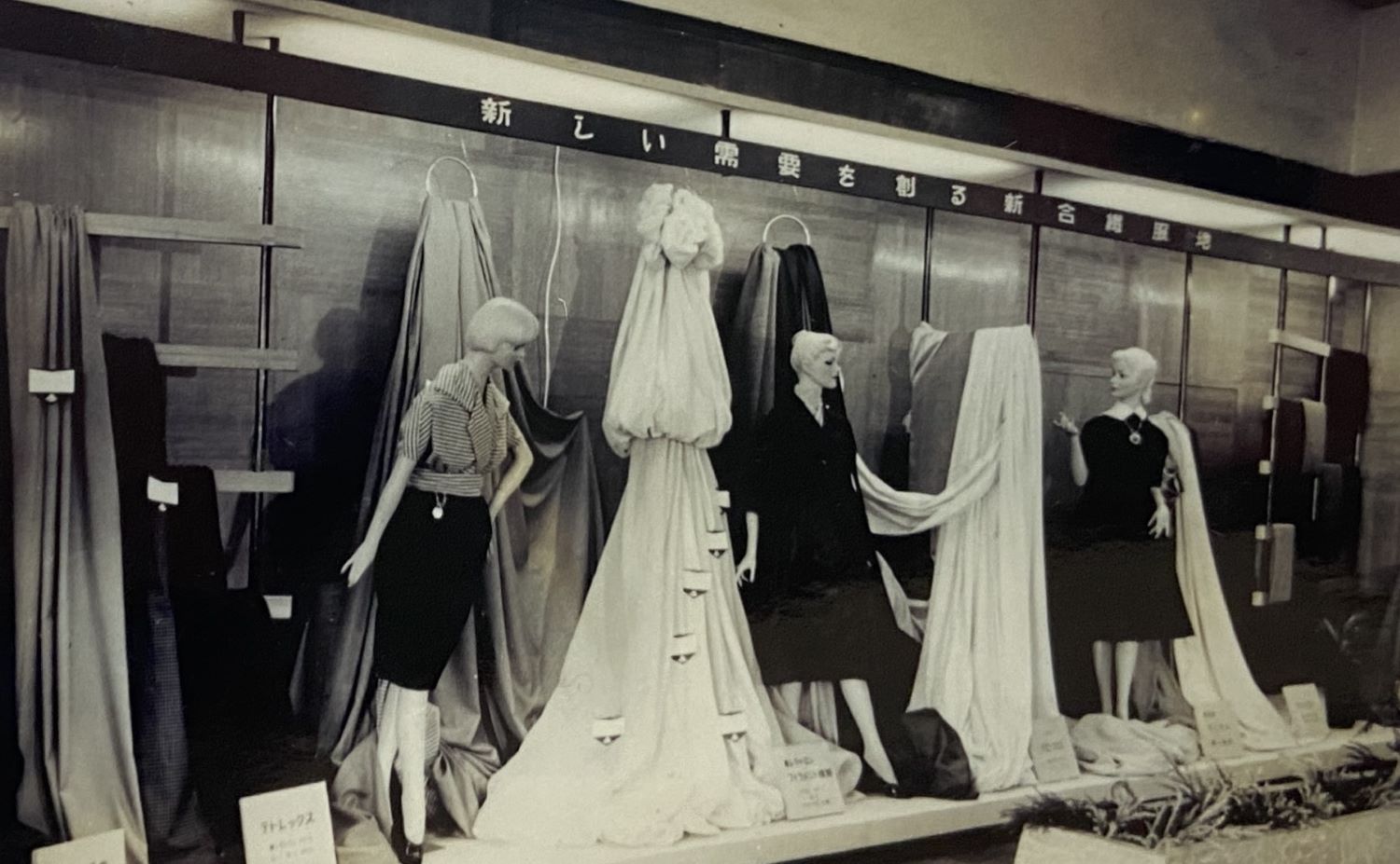 昭和33年、5階展示ホールでの合繊服地の展示会。