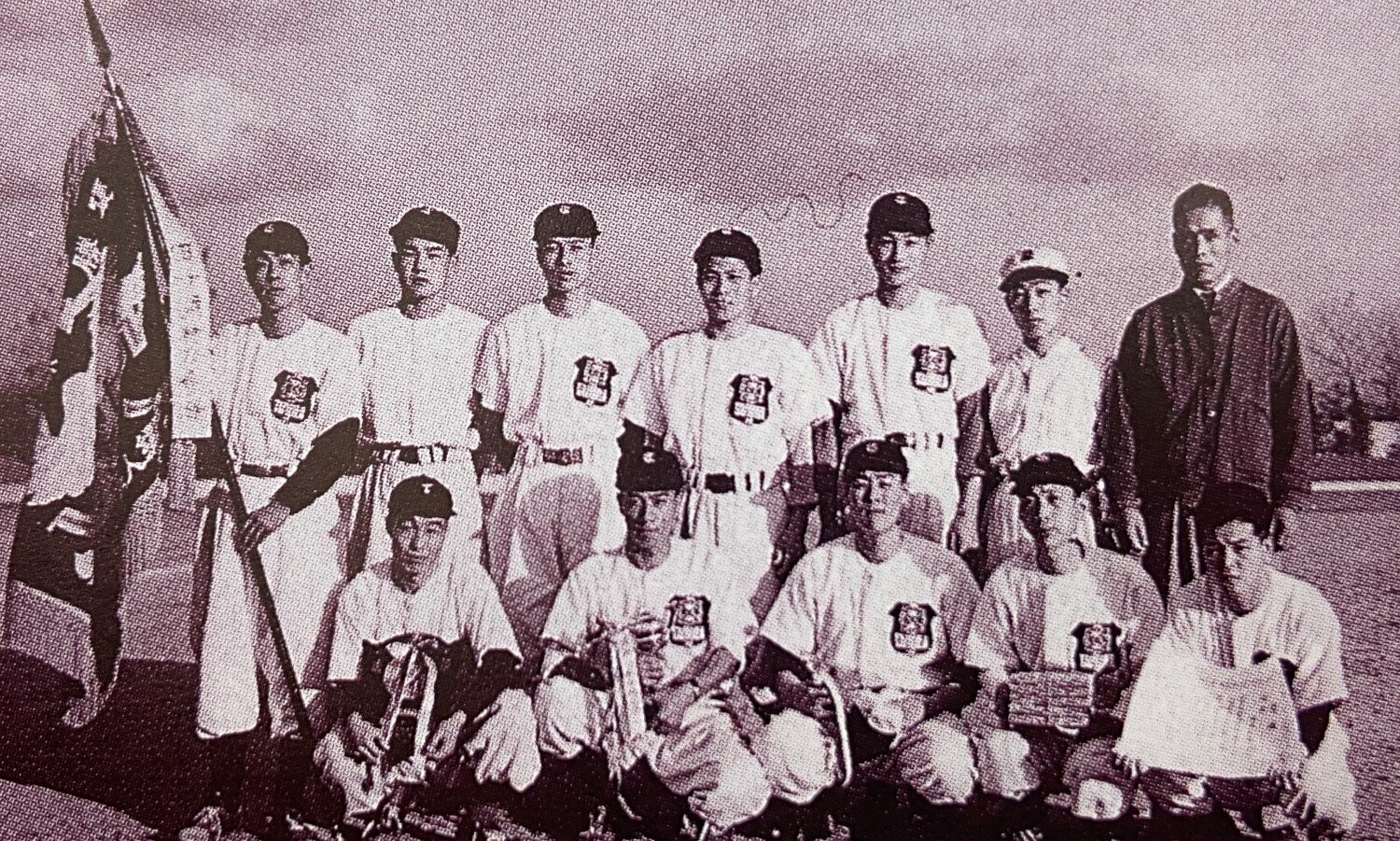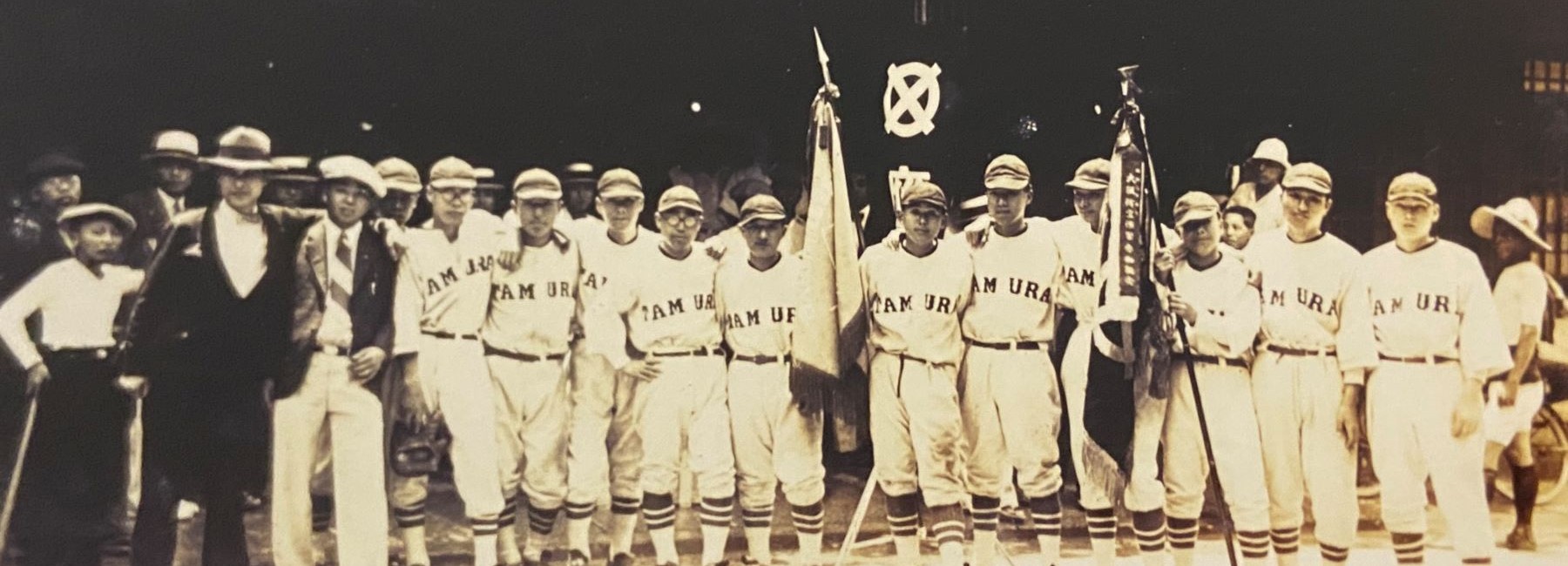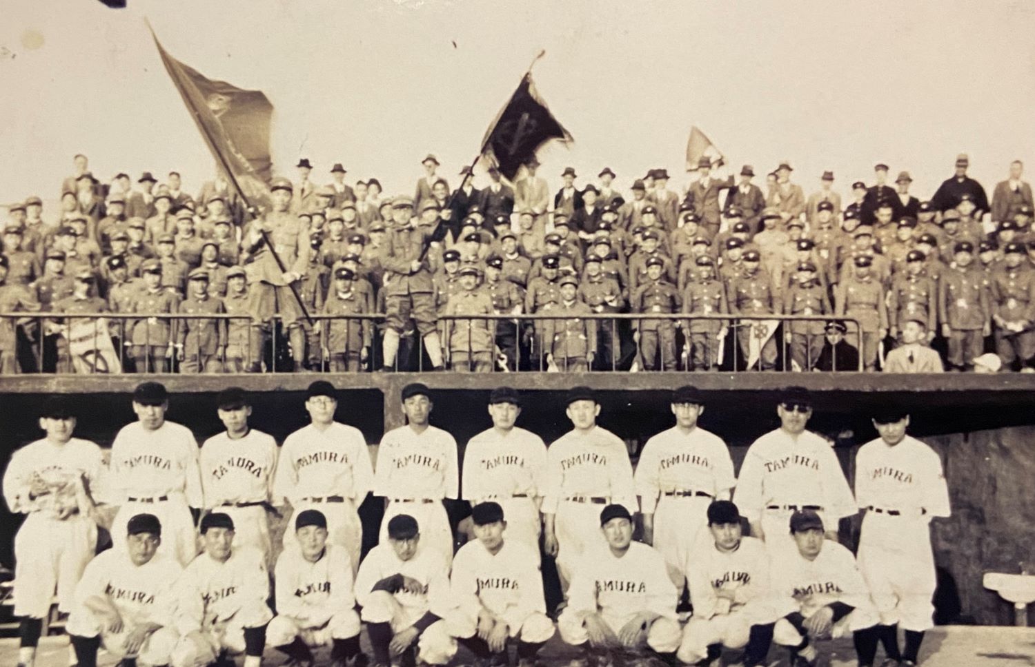 昭和10年頃、堺の球場で。メンバーの後ろには応援団。