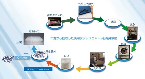 使用済みとなった「BA-4 マットレス」を回収し、中材の「ブレスエアー®」を粉砕、バージンの「ブレスエアー®」原料と混ぜて再生「ブレスエアー®」で「BA-4 マットレス」を再生産します。