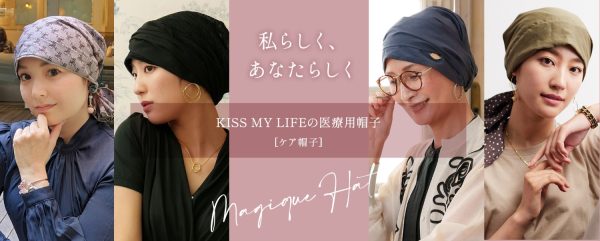 特に、抗がん剤治療中に髪の毛が抜けた際に、おしゃれに着用できるがんケア帽子は人気があり、「KISS MY LIFE」の主力商品です。形、柄、素材感まで徹底的にこだわっています。