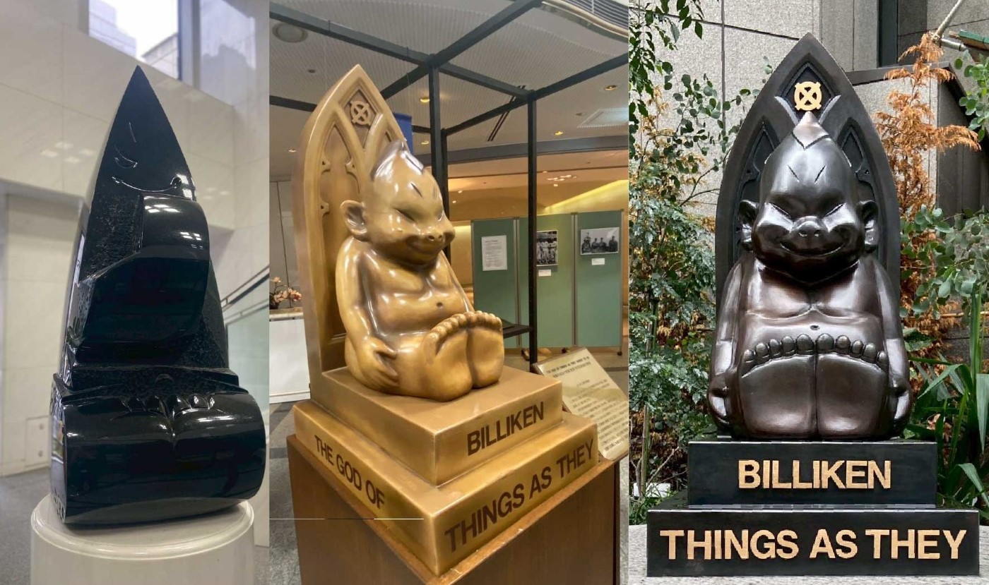 流政之氏作の「コマビリケン」、1949年(昭和24年)製作の通天閣2代目ビリケンさんのモデルになった「田村駒ビリケン像」、創業130年を記念して大阪本社ビル前に設置された「船場のビリケンさん」です。皆様お気に入りのビリケンさんとの写真撮影を楽しまれていました。
